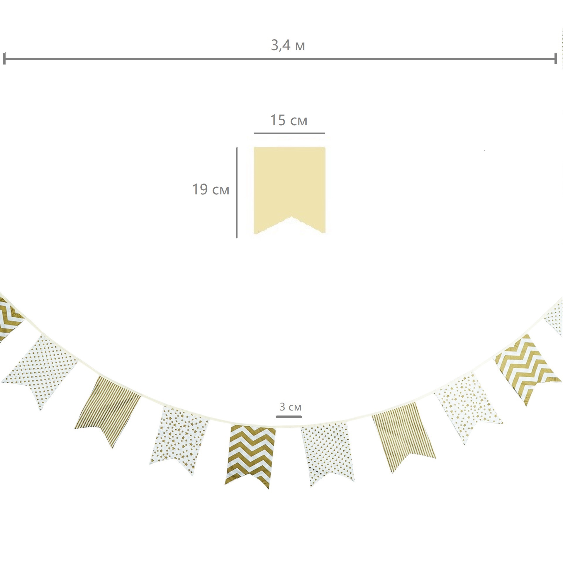 Гирлянда состоит из 12 флажков, общая длина составляет 3,4 м, расстояние между флажками 3 см, длина матерчатых флажков 2,1 м, длина лямок с обеих сторон по 50 см