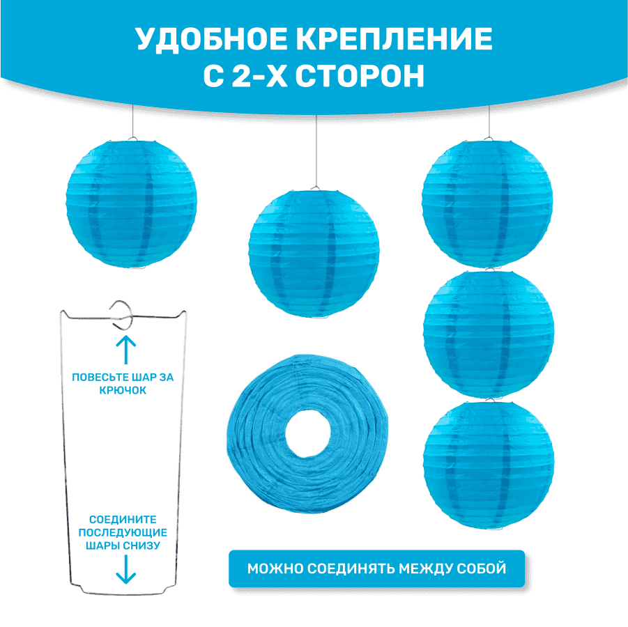 В комплект входит 8 бумажных фонариков и лента.