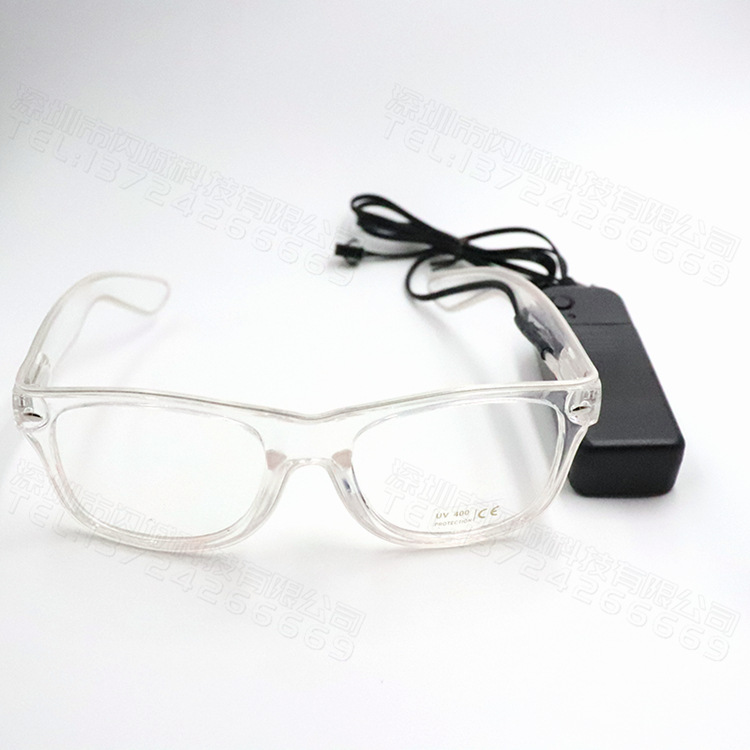 Светодиодные очки имеют прозрачную оправу, прозрачные линзы. Работают от двух батареек 2АА