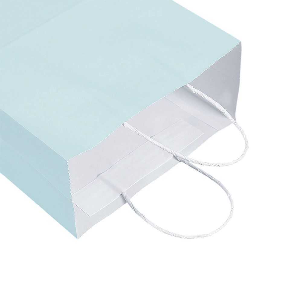 Подарочный пакет из крафтовой бумаги пастельного оттенка с белыми бумажными ручками и белой внутренней стороной.